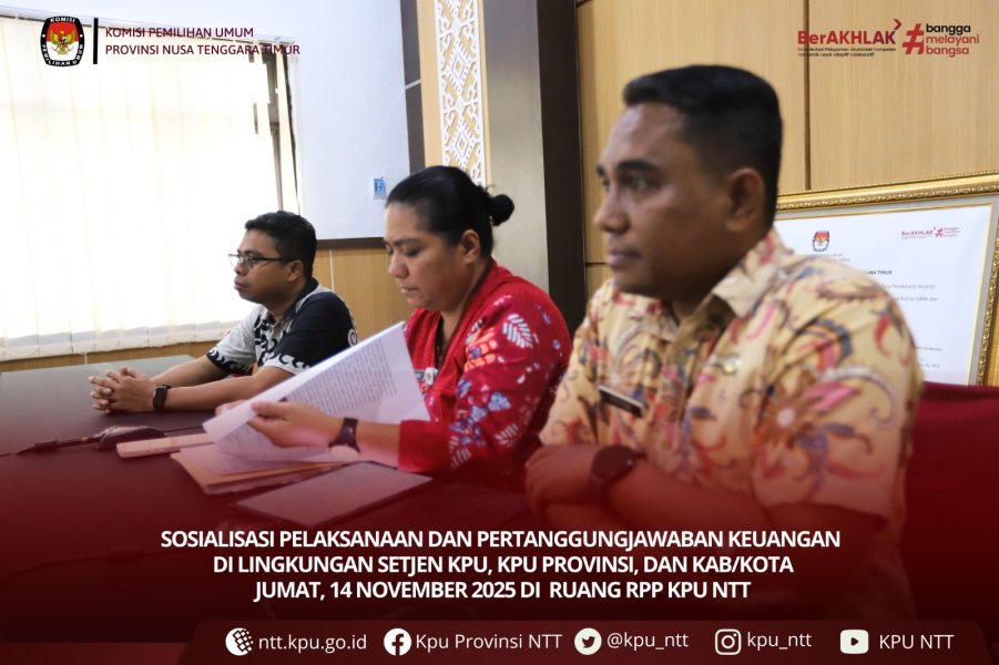 Kupang, ntt.kpu.go.id - Komisi Pemilihan Umum Provinsi Nusa Tenggara Timur mengikuti Sosialisasi Pelaksanaan dan Pertanggungjawaban Keuangan yang diselenggarakan oleh Sekretariat Jenderal KPU Republik Indonesia pada Jumat (14/11) di ruang RPP KPU NTT. Kegiatan ini dilaksanakan secara hybrid, bertempat di Ruang Rapat Inspektorat Utama Setjen KPU, Jakarta, serta melalui aplikasi Zoom Meeting. Kegiatan sosialisasi ini bertujuan untuk meningkatkan pemahaman mengenai tata kelola pelaksanaan dan pertanggungjawaban keuangan yang transparan dan akuntabel, sekaligus menindaklanjuti hasil Penilaian SPI Tahun 2024 di lingkungan KPU RI, KPU Provinsi, serta KPU Kabupaten/Kota. Dari KPU Provinsi NTT, kegiatan ini diikuti oleh Plt. Sekretaris KPU NTT Melanie Sari Willa Hege, Kabag Keuangan, Umum dan Logistik Carolus F. Dengi, Kasubbag Keuangan Peiter G. Nappoe, serta staf pelaksana yang menangani pengelolaan dan pelaporan keuangan. Dalam kegiatan ini, Irwil 3 KPU RI Ferry Syahminan menekankan pentingnya keteraturan dalam setiap proses pengelolaan anggaran, mulai dari perencanaan, pelaksanaan, penatausahaan, hingga pertanggungjawaban keuangan. Penyampaian materi juga menyoroti langkah-langkah penguatan pengawasan internal serta upaya memastikan kesesuaian proses keuangan dengan standar akuntabilitas penyelenggara negara. KPU RI berharap kegiatan ini dapat meningkatkan kompetensi dan kesiapan seluruh satuan kerja dalam menghadapi pemeriksaan maupun proses pelaporan keuangan berbasis regulasi nasional dan standar audit yang berlaku. Dengan mengikuti sosialisasi ini, KPU Provinsi NTT berkomitmen memperkuat kualitas tata kelola keuangan lembaga secara konsisten, profesional, dan transparan sebagai bagian dari penyelenggaraan pemilu yang akuntabel dan berintegritas. ....