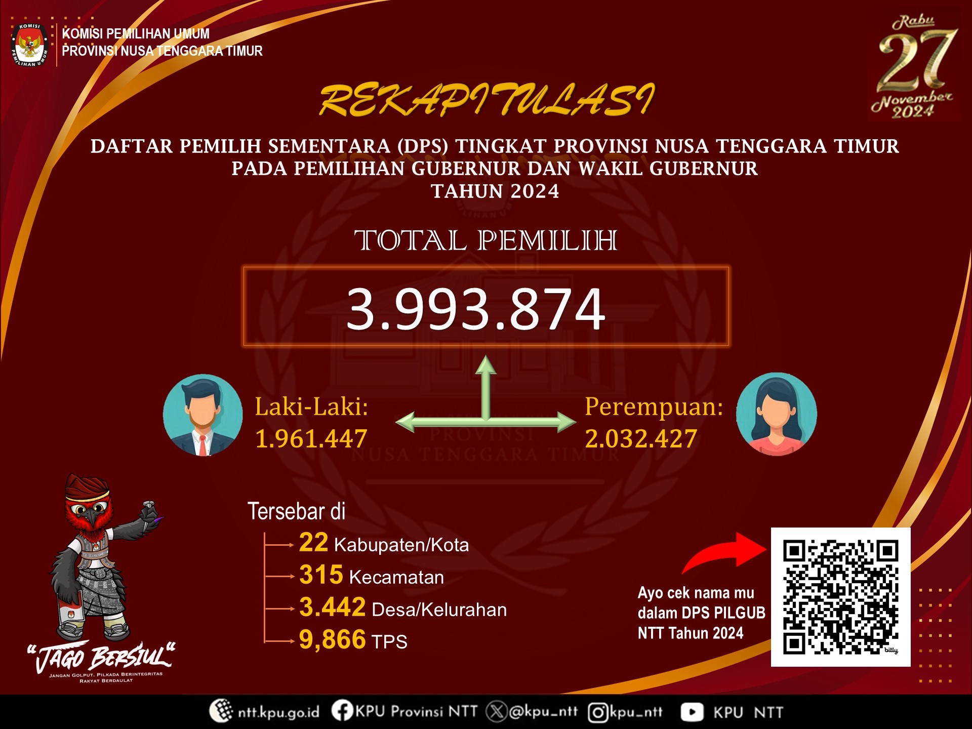 PEMILIH PEMILU SERENTAK 2024 Thomas Dohu, ketua KPU Provinsi NTT Terdapat dua data yang dihasilkan dari proses pemutakhiran data pemilih sebelum menjadi daftar pemilih tetap yakni daftar pemilih sementara dan daftar pemilih sementara hasil perbaikan. Daftar pemilih sementara di Provinsi NTT telah ditetapkan tanggal 5 april 2023 sebanyak 4.019.618 pemilih dengan jumlah TPS sebanyak 16.855 sedangkan daftar pemilih sementara hasil perbaikan yang ditetapkan tanggal 12 mei 2023 sebanyak 4.016.844 dengan jumlah TPS sebanyak 16.750. Data DPSHP juga menguraikan pemilih berpotensi non ktp elektronik sebanyak 237.659, pemilih disabilitas sebanyak 46.395. Jumlah pemilih maupun TPS masih dimungkinkan berubah karena proses pencermatan data masih berlangsung hingga ditetapkan daftar pemilih tetap tanggal 21 juni 2023. Daftar Pemilih Sementara (DPS) DPS adalah daftar pemilih hasil kegiatan pemutakhiran data pemilih yang dilakukan oleh KPU Kabupaten/Kota dengan dibantu oleh PPK, PPS, dan Pantarlih. Sumber data kegiatan pemutakhiran data pemilih adalah data penduduk potensial pemilih dan daftar pemilih berkelanjutan. Data penduduk potensial pemilih diperoleh dari pemerintah dan pemerintah daerah yang disediakan dalam bentuk: 1) data penduduk potensial pemilih pemilu dan 2) data warga negara Indonesia yang bertempat tinggal di luar negeri. Data kependudukan tersebut disinkronkan oleh pemerintah bersama KPU untuk menjadi data penduduk potensial pemilih pemilu. Selanjutnya KPU Kabupaten/Kota menggunakan data penduduk potensial pemilih pemilu untuk disandingkan dengan daftar pemilih tetap pemilu terakhir yang dimutakhirkan secara berkelanjutan sebagai bahan penyusunan daftar pemilih. Daftar pemilih dimaksud paling sedikit memuat nomor induk kependudukan, nama, tanggal lahir, jenis kelamin, dan alamat Warga Negara Indonesia, yang mempunyai hak memilih. Dua sumber data pemilu dihasilkan oleh lembaga yang berbeda yakni dinas kependudukan dan catatan sipil Kabupaten/Kota sedangkan data pemilih berkelanjutan diperoleh dari KPU Kabupaten/Kota. Lokus data diperoleh dari wilayah administrasi yang sama yaitu Kabupaten/Kota. Tehnik memperoleh data masing-masing juga berbeda, kalau data kependudukan diperoleh berdasarkan registrasi data yang dicatat berupa data kelahiran, kematian, perkawinan, perpindahan penduduk, perceraian, adopsi anak, dan lain-lain. Registrasi data pada dasarnya menganut stelsel aktif bagi penduduk. Norma tersebut mengatur bahwa asas pencatatan sipil membebankan kewajiban bagi penduduk untuk mendaftarkan setiap peristiwa penting, termasuk kelahiran anak. Hal ini dilakukan karena terbatasnya sumber daya petugas pencatatan sipil dilain pihak jumlah penduduk banyak dan wilayah kerja juga sangat luas. Data dimaksud dipilah berdasarkan umur dan perkawinan untuk dipersiapkan sebagai data penduduk potensial pemilih pemilu. Adapun sistem pendataan pemilih berkelanjutan berdasarkan pencermatan data pemilu/pemilihan tetap terakhir dan koordinasi data dengan instansi terkait seperti dinas kependudukan dan catatan sipil, dinas pendidikan, TNI, Polri. Koordinasi dimaksud untuk mendapatkan data pemilih baru, pemilih pindah domisili dan pemilih meninggal dunia. Pelaksanaanya setiap bulan lalu dilakukan rekapitulasi secara berjenjang mulai dari KPU Kabupaten/Kota, KPU Provinsi dan KPU. Data Pemilih Sementara Hasil Perbaikan (DPSHP) DPSHP adalah DPS yang telah diperbaiki berdasarkan masukan dan tanggapan masyarakat dan/atau peserta Pemilu. Setelah DPS ditetapkan oleh KPU Kabupaten/Kota dilakukan pengumuman diseluruh desa/kelurahan untuk mendapat masukan dan tanggapan masyarakat. Tidak hanya itu, DPS dalam bentuk soft file juga wajib diserahkan kepada peserta pemilu agar peserta pemilu masing-masing tingkatan melakukan pencermatan DPS dan apabila ditemukan pemilih belum didaftar atau ditemukan pada DPS dengan kategori pemilih tidak memenuhi syarat seperti pemilih belum berumur 17 tahun dan belum pernah kamwin/menikah, pemilih ganda, pemilih meninggal dunia, pemilih telah menjadi anggota TNI/Polri dapat memberikan masukan kepada KPU sesuai tingkatanya. Kesempatan bagi masyarakat dan peserta pemilu menyampaikan masukan dan tanggapan terhadap DPS diberi kesempatan selama 21 hari yakni mulai tanggal 12 april sampai dengan 2 mei 2023. Berdasarkan pencermatan dan masukan tanggapan masyarakat tersebut selanjutnya DPSHP dilakukan rekapitulasi kembali melalui rapat pleno secara berjenjang mulai dari desa/kelurahan, kecamatan dan KPU Kabupaten mulai tanggal 7 mei sampai dengan 12 mei 2023. Daftar Pemilih Tetap (DPT) DPT adalah DPSHP Akhir yang telah diperbaiki oleh PPS, direkapitulasi oleh PPK, dan ditetapkan oleh KPU Kabupaten/Kota. Disebut proses akhir karena telah dilalui beberapa tahapan mulai dari proses pencocokan dan penelitian data pemilih melibatkan pantarlih, penyusunan DPS, perbaikan DPS, penyusunan DPSHP. DPT tidak hanya menguraikan daftar pemilih dengan elemen data lengkap tetapi juga mengetahui jumlah TPS dengan ketentuan satu TPS paling banyak 300 pemilih. DPT memiliki makna yang paling mendasar dalam proses pemilu di Indonesia yaitu: pertama, memberikan kepastian bahwa warga negara Indonesia yang telah memenuhi syarat sebagai pemilih telah terdaftar dalam daftar pemilih; kedua, sebagai sumber data dalam melayani pemilih pindah memilih di TPS lain; ketiga sebagai sumber data dalam mengelola kebutuhan logistik pemilu seperti perlengkapan pemungutan dan penghitungan suara di TPS: kotak suara, bilik suara, surat suara, tinta, alat coblos, segel dan TPS; dan keempat, sebagai sumber data dalam merancang kebutuhan penyelenggara di TPS, pengamanan TPS serta kebutuhan saksi oleh peserta pemilu. Cek Mandiri Daftar Pemilih Saat ini KPU telah mengembangkan suatu aplikasi untuk mengetahui pemilih telah terdaftar pada daftar pemilih. Proses pengecekan dilakukan dengan cara membuka link: cekdptonline.kpu.go.id kemudian pemilih mengetik nomor induk kependudukan lalu akan memperoleh hasil pencarian data pemilih pemilu 2024. H