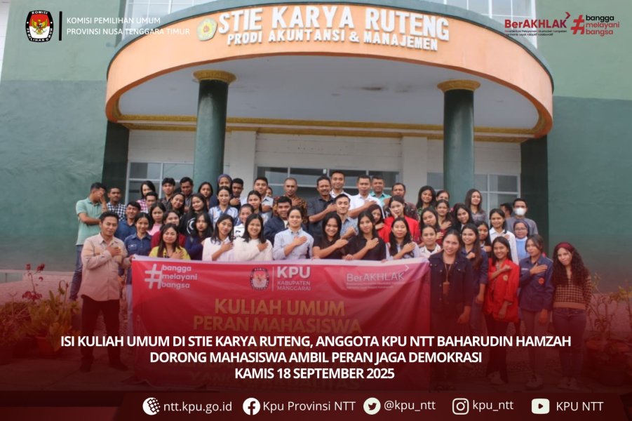 Ruteng, ntt.kpu.go.id — Anggota KPU Provinsi NTT, Dr. Baharudin Hamzah, S.Pd., M.Si., hadir di STIE Karya Ruteng sebagai narasumber kuliah umum bertema “Peran Mahasiswa dalam Membangun Demokrasi yang Berkualitas” pada Kamis (18/9). Kegiatan ini menjadi sarana memperkuat literasi kepemiluan bagi mahasiswa sekaligus mendorong keterlibatan generasi muda dalam mengawal jalannya demokrasi.