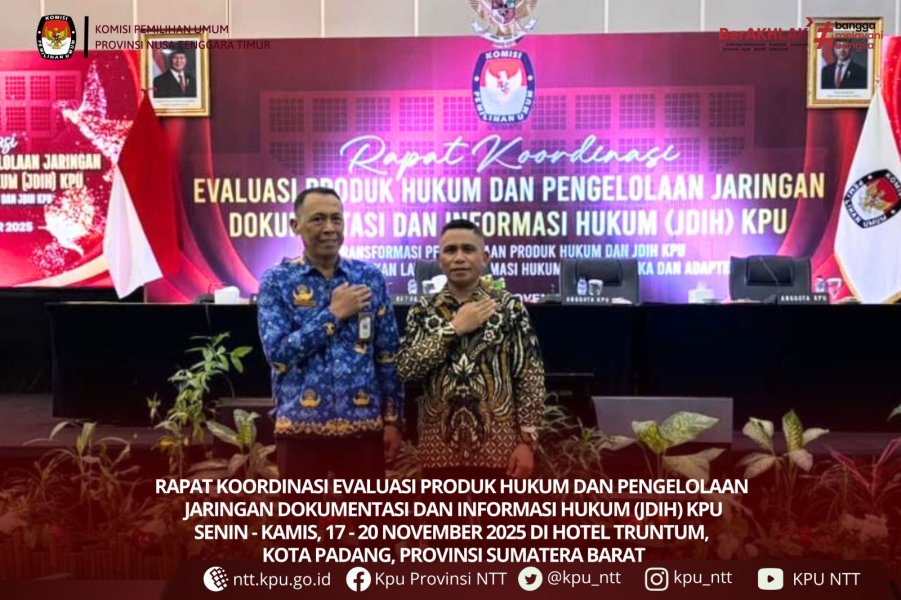 Padang, ntt.kpu.go.id - Anggota KPU NTT Divisi Hukum dan Pengawasan Petrus Kanisius Nahak bersama Kasubbag Hukum Edson Carlos mengikuti Rapat Koordinasi Evaluasi Produk Hukum dan Pengelolaan Jaringan Dokumentasi dan Informasi Hukum (JDIH) KPU dengan tema “Transformasi Pengelolaan Produk Hukum dan JDIH KPU dalam Mewujudkan Layanan Informasi Hukum yang Terbuka dan Adaptif.” Kegiatan ini berlangsung di Hotel Truntum, Padang, Sumatera Barat, pada 17–20 November 2025.