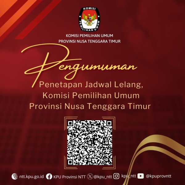 PENGUMUMAN LELANG Nomor 1659/RT.01.3-PU/53/2025 Berdasarkan Surat Kepala Kantor Pelayanan Kekayaan Negara dan Lelang (KPKNL) Kupang Nomor: JL-793/1/KNL.1405/2025 tanggal 9 Desember 2025 hal Penetapan Jadwal Lelang, Komisi Pemilihan Umum Provinsi Nusa Tenggara Timur akan melaksanakan Lelang Noneksekusi Wajib barang milik negara berupa 1 (satu) unit kendaraan bermotor roda 2 (dua) kondisi rusak berat (scrap) dengan perantaraan KPKNL Kupang sebagaimana terlampir. Saat ini barang-barang tersebut berada di Gudang Komisi Pemilihan Umum Provinsi Nusa Tenggara Timur, yang beralamat di Jl. Polisi Militer No. 1 Kecamatan Oebobo, Kota Kupang....
