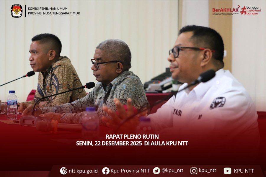 Kupang, ntt.kpu.go.id - Komisi Pemilihan Umum Provinsi Nusa Tenggara Timur (KPU Provinsi NTT) melaksanakan Rapat Pleno Rutin pada Senin, (22/12), di Aula KPU Provinsi NTT. Rapat pleno dipimpin oleh Ketua KPU Provinsi NTT, Jemris Fointuna, dan diikuti oleh Anggota KPU Provinsi NTT, Elyaser Lomi Rihi, Petrus Kanisius Nahak, Pejabat Struktural, Pejabat Fungsional, Staf jajaran Sekretariat.