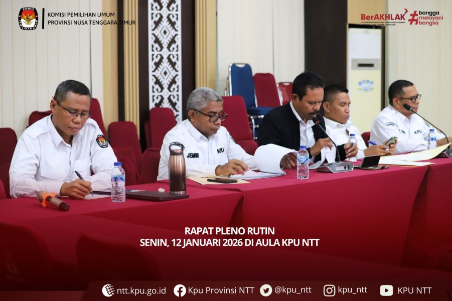 Kupang, ntt.kpu.go.id - Komisi Pemilihan Umum (KPU) Provinsi Nusa Tenggara Timur melaksanakan Rapat Pleno Rutin Senin (12/1). Ketua KPU Provinsi NTT, Jemris Fointuna, memimpin rapat dan didampingi Anggota KPU Provinsi NTT Lodowyk Fredrik, Baharudin Hamzah, Elyaser Lomi Rihi, dan Petrus Kanisius Nahak, serta dihadiri Pejabat Struktural, Pejabat Fungsional, dan Notulis.