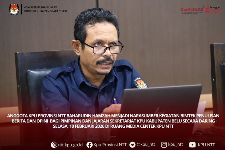 Kupang, ntt.kpu.go.id – Komisi Pemilihan Umum (KPU) Provinsi Nusa Tenggara TimurAnggota Komisi Pemilihan Umum Provinsi Nusa Tenggara Timur Baharudin Hamzah menjadi narasumber kegiatant Bimbingan Teknis Penulisan Berita dan Opini bagi pimpinan dan jajaran sekretariat KPU Belu yang digelar Selasa (10/2) secara daring.
