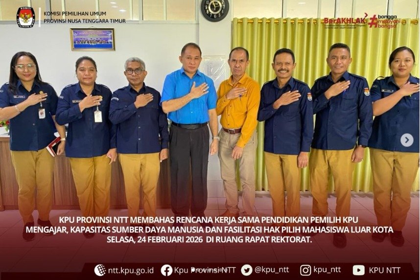 Kupang, ntt.kpu.go.id - Komisi Pemilihan Umum Provinsi Nusa Tenggara Timur bersama pimpinan Universitas Kristen Artha Wacana Kupang Selasa (24/2/2026) membahas rencana kerja sama pendidikan pemilih KPU Mengajar, kapasitas sumber daya manusia dan fasilitasi hak pilih mahasiswa luar Kota di ruang Rapat Rektorat.