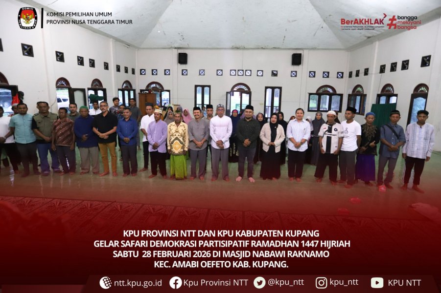 Kupang, ntt.kpu.go.id —KPU Provinsi Nusa Tenggara Timur dan KPU Kabupaten Kupang gelar Safari Demokrasi Partisipatif Ramadhan 1447 Hijriah, Sabtu (28/2) di Masjid Nabawi Raknamo Kecamatan Amabi Oefeto Kabupaten Kupang.