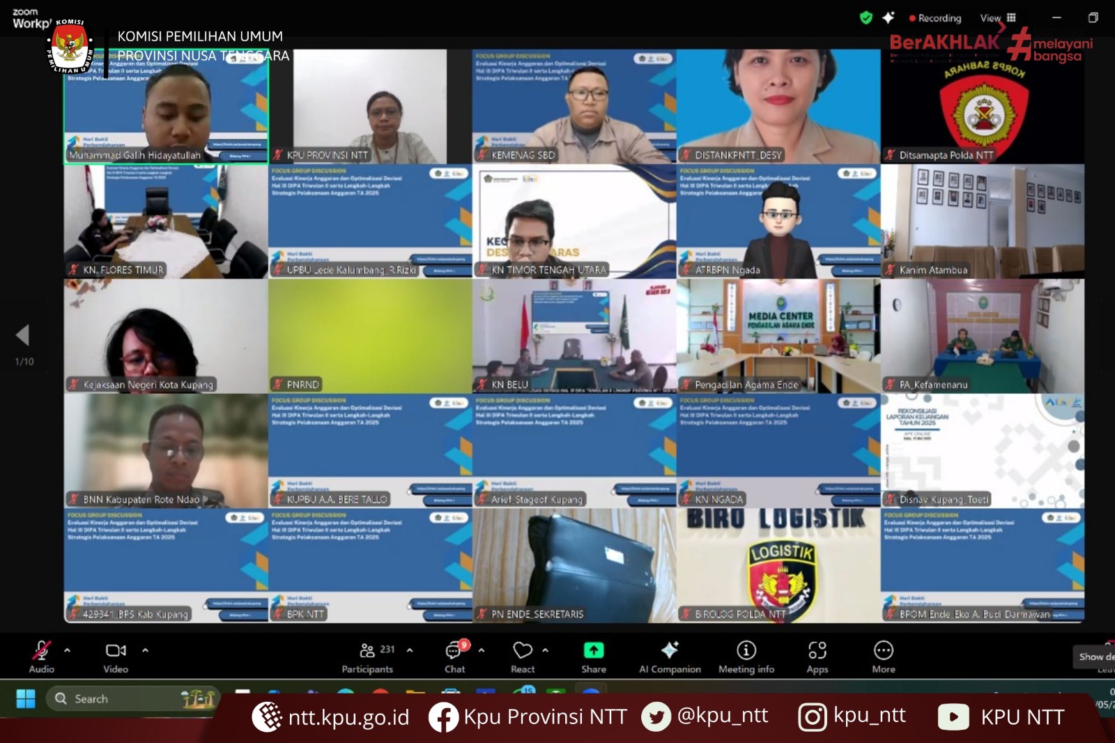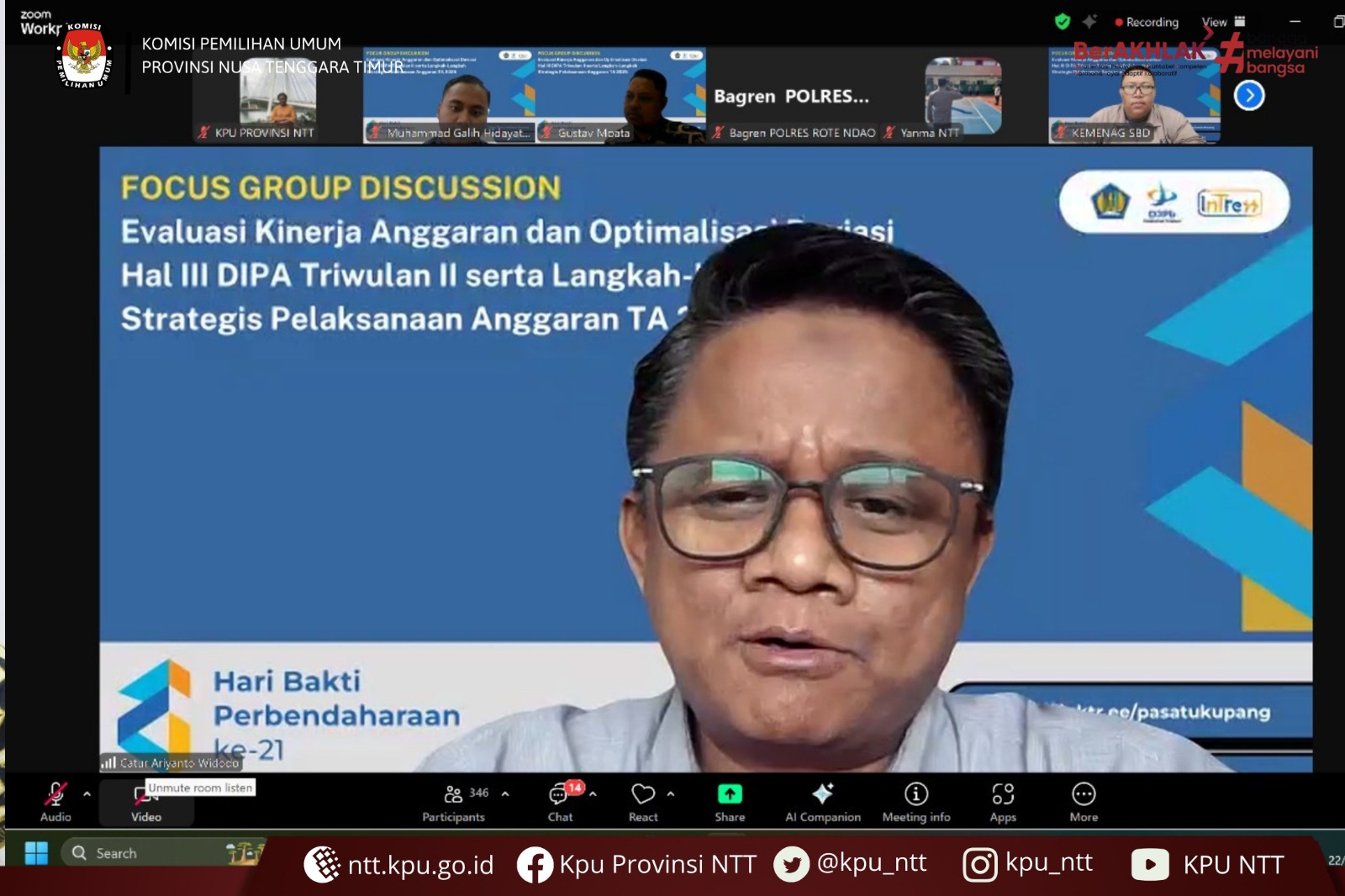 #TemanPemilih, dalam upaya mengakselerasi belanja APBN dan mengoptimalkan Indikator Deviasi Halaman III DIPA Triwulan II, KPU Provinsi NTT turut serta dalam Focus Group Discussion (FGD) Evaluasi Kinerja Anggaran dan Optimalisasi Deviasi Halaman III DIPA Triwulan II serta Langkah-Langkah Strategis Pelaksanaan Anggaran TA 2025. Kegiatan ini dilaksanakan secara daring melalui Zoom Meeting yang diselenggarakan oleh DJPb Kementerian Keuangan Kanwil NTT pada Kamis, 22 Mei 2025.