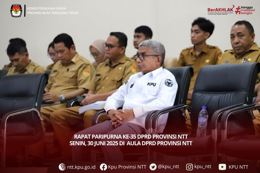 Kupang, ntt.kpu.go.id – Ketua Komisi Pemilihan Umum (KPU) Provinsi Nusa Tenggara Timur, Jemris Fointuna, hadir dalam Rapat Paripurna ke-35 DPRD Provinsi NTT yang digelar di Gedung DPRD, Senin (30/6). Sidang paripurna ini merupakan bagian dari Masa Persidangan III Tahun Sidang 2024-2025.