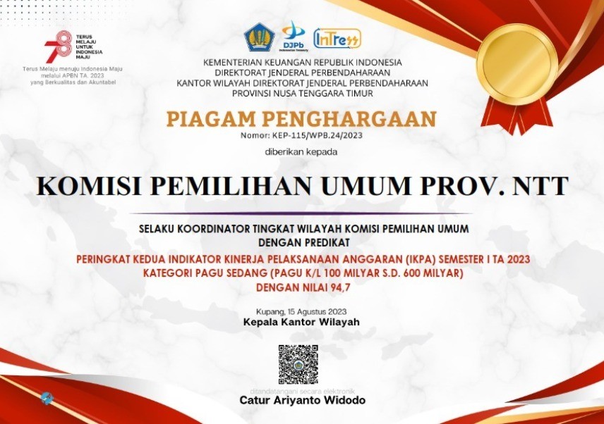Selaku Koordinator Tingkat Wilayah KPU Provinsi NTT meraih predikat peringkat kedua dalam Indikator Kinerja Pelaksanaan Anggaran (IKPA) Semester I Tahun Anggaran 2023, Kategori Pagu Sedang (Pagu K/L 100 Milyar s.d 600 Milyar), dengan skor 94,7. Sementara itu, KPU Kabupaten Timor Tengah Selatan berhasil memperoleh predikat peringkat pertama sebagai Satuan Kerja Terbaik dalam pemanfaatan Internet Banking/Cash Management System (CMS), dengan jumlah volume transaksi CMS tertinggi sebanyak 10.563 pada Semester I Tahun Anggaran 2023, dan KPU Kabupaten Flores Timur dengan predikat peringkat ketiga dalam hal yang sama, dengan jumlah volume transaksi CMS tertinggi sebanyak 8.939 pada periode yang sama. Prestasi ini menjadi contoh terbaik dalam mengedepankan transparansi, akuntabilitas, dan efisiensi dalam pengelolaan dana publik di wilayah Nusa Tenggara Timur.