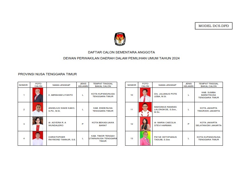 Pengumuman DCS Anggota DPD Provinsi NTT Dalam Pemilu 2024