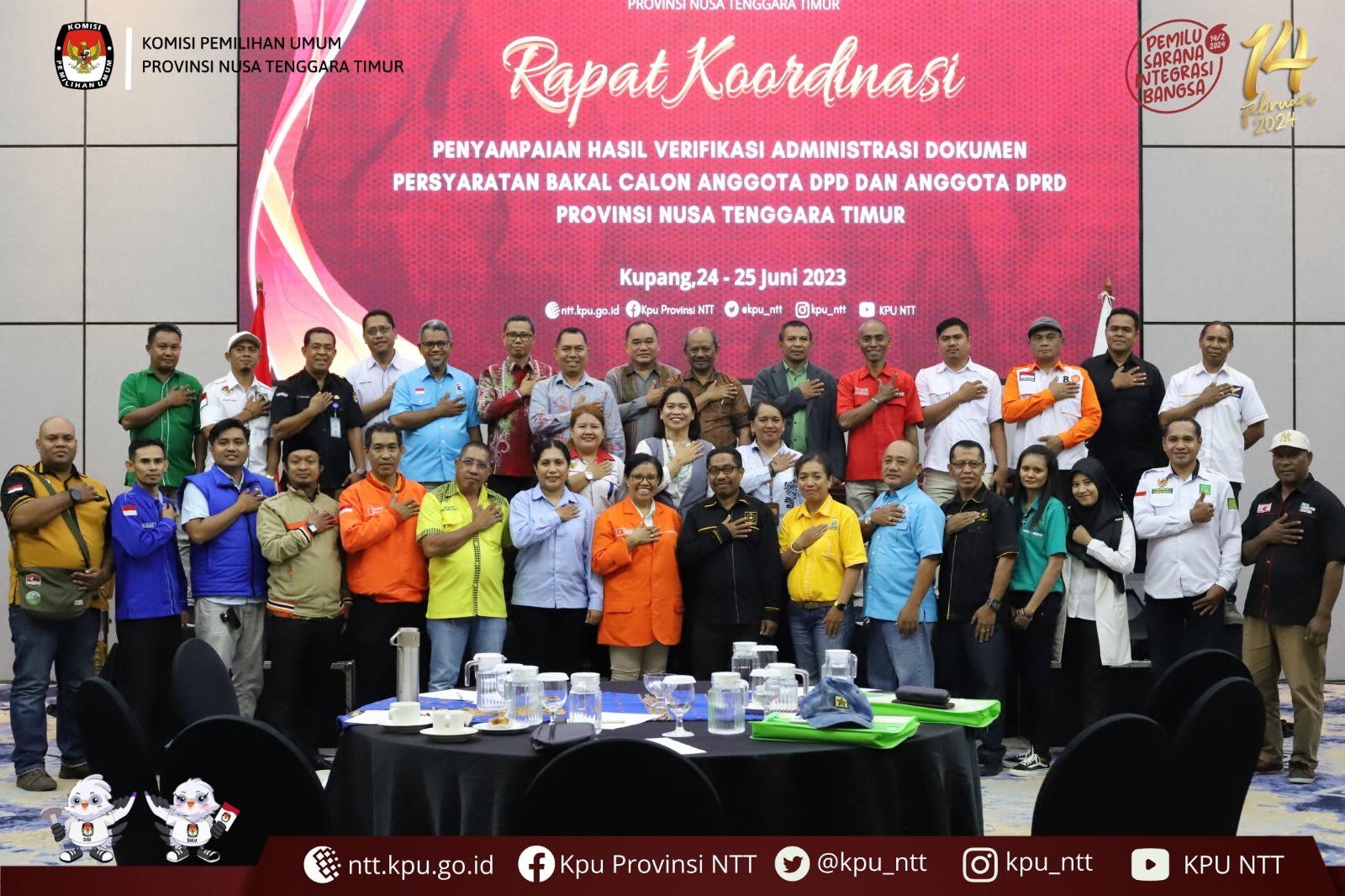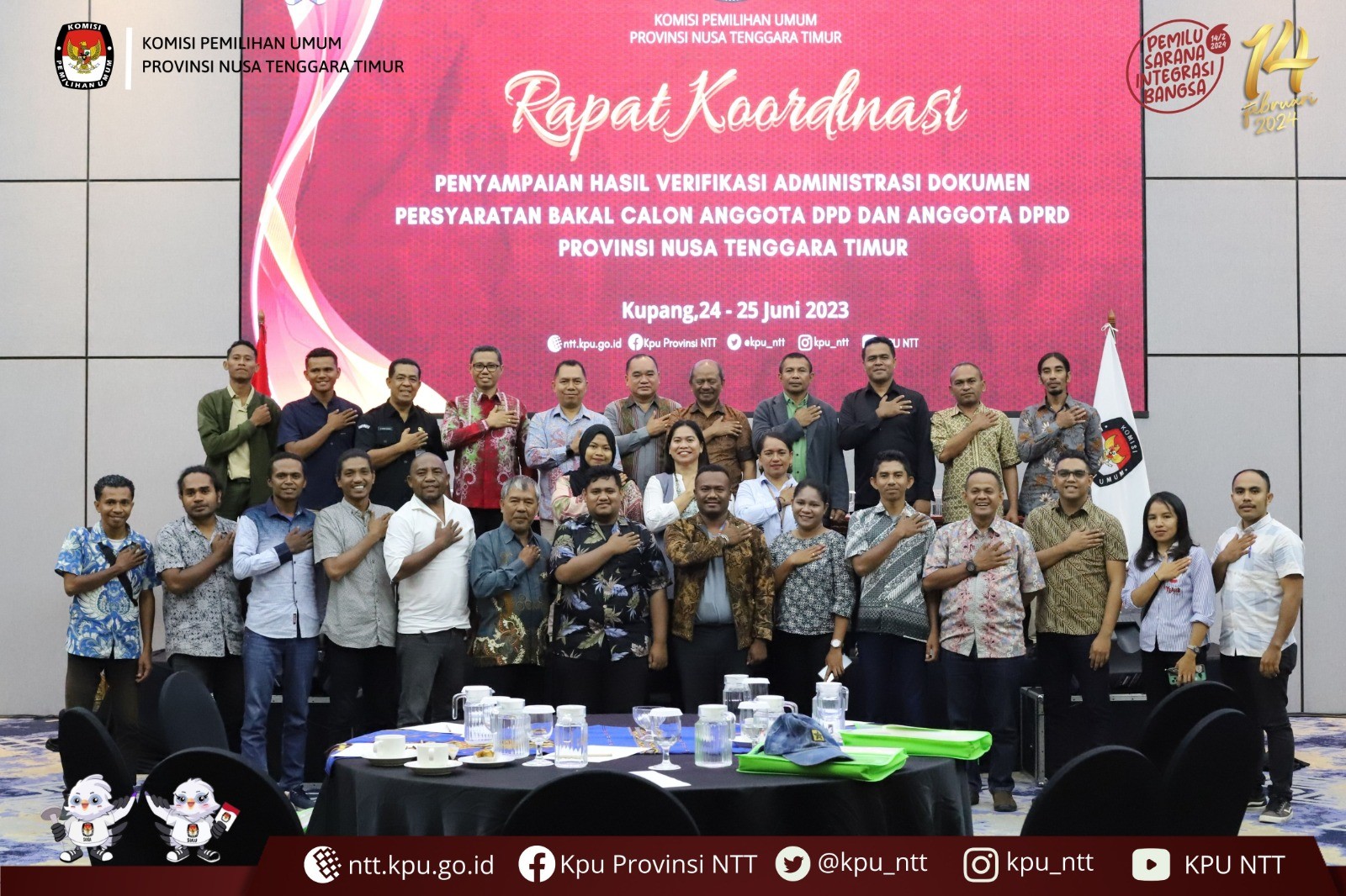 Kupang, KPU Provinsi Nusa Tenggara Timur melaksanakan kegiatan Rapat Koordinasi Penyampaian Hasil Verifikasi Administrasi Dokumen Persyaratan Bakal Calon Anggota DPD dan Anggota DPRD Provinsi Nusa Tenggara Timur bertempat di Hotel Harper Kupang, Sabtu (25/06/2023).