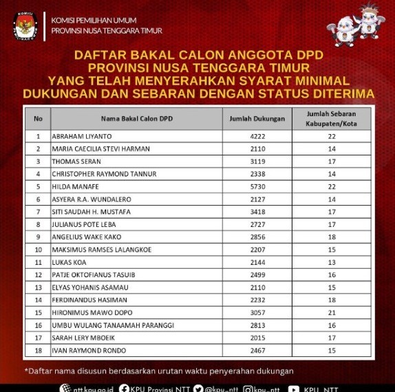 Dari total 23 Bakal Calon Anggota Dewan Perwakilan Daerah (DPD) Provinsi NTT yang menyerahkan dokumen persyaratan dukungan minimal pemilih, hanya 18 Bakal Calon Anggota DPD yang diterima oleh KPU Provinsi NTT termasuk didalamnya 4 Anggota Dewan Perwakilan Daerah RI Daerah Pemilihan Provinsi NTT yang masih menjabat di parlemen saat ini yakni Abraham Liyanto, Hilda manafe, Asyera R. A Wundalero, dan Angelius Wake Kako, sedangkan 5 Bakal Calon Anggota DPD yang lain dikembalikan dengan catatan dokumen tidak lengkap.