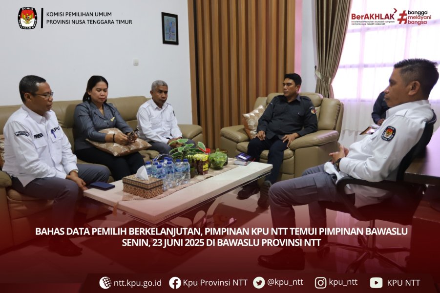 Kupang, ntt.kpu.go.id — Komisi Pemilihan Umum (KPU) Provinsi Nusa Tenggara Timur menyambangi Kantor Bawaslu Provinsi NTT pada Senin (23/6) dalam rangka memperkuat sinergi kelembagaan terkait pemutakhiran data pemilih berkelanjutan. Kunjungan ini merupakan bagian dari upaya bersama dalam menjaga akurasi, integritas, dan akuntabilitas data pemilih. Turut hadir dalam pertemuan tersebut Ketua KPU Provinsi NTT, Jemris Fointuna, bersama seluruh anggota, yakni Lodowyk Fredrik, Baharudin Hamzah, Elyaser Loni Rihi, dan Petrus Kanisius Nahak. Dari pihak Bawaslu Provinsi NTT, hadir Ketua Nonato Da Purificacao Sarmento serta Anggota Melpi Minalria Marpaung. Mengawali diskusi, Jemris menyampaikan bahwa pertemuan ini bertujuan untuk menjalin komunikasi teknis terkait dinamika yang muncul dalam proses pemutakhiran DPB, serta mendorong penyamaan pemahaman terhadap langkah-langkah pembaruan data yang sedang dilaksanakan. “Koordinasi ini menjadi bagian penting dalam menjaga kualitas daftar pemilih agar tetap akurat, mutakhir, dan dapat dipertanggungjawabkan,” ujar Jemris. Anggota KPU Provinsi NTT, Lodowyk Fredrik, menjelaskan bahwa salah satu fokus pemutakhiran adalah pada penanganan data pemilih yang telah meninggal dunia namun masih tercantum dalam daftar, serta data anomali lain yang ditemukan selama proses pencermatan internal. Pemutakhiran semacam ini memerlukan ketelitian karena status data dapat berdampak langsung terhadap tahapan penyelenggaraan pemilu. “Kami akan melakukan sinkronisasi terhadap data pemilih, termasuk nama-nama yang secara administratif masih terdaftar meskipun yang bersangkutan telah meninggal dunia. Jika terdapat bukti yang sah, maka data tersebut akan dinonaktifkan dari daftar. Sebaliknya, apabila terdapat pemilih yang dinyatakan meninggal tetapi ternyata masih hidup, maka statusnya juga harus segera diperbaiki,” ungkap Fredrik. Dalam kesempatan tersebut, Fredrik juga menambahkan bahwa proses pemutakhiran data pemilih dilakukan melalui sinkronisasi dengan data kependudukan yang tersedia di Kementerian Dalam Negeri. Ia menjelaskan bahwa data dari Kemendagri umumnya sudah dilengkapi dengan akta kematian, sehingga dapat digunakan untuk pemutakhiran data. Namun demikian, terdapat pula referensi data lain yang berasal dari instansi seperti BPJS dan BPS yang mencantumkan status kematian pemilih, tetapi tidak disertai dokumen pendukung seperti akta kematian. Menurut Fredrik, perbedaan inilah yang menjadi catatan penting untuk ditindaklanjuti secara cermat. “Untuk data yang belum disertai akta kematian, diperlukan klarifikasi lebih lanjut di lapangan. Maka dari itu, kami memandang perlu dilakukan coklit terbatas untuk mencocokkan informasi tersebut secara faktual. Pelaksanaan ini akan dikoordinasikan dengan Bawaslu agar berjalan secara terarah dan sesuai mekanisme,” lanjut Fredrik. Ia menegaskan bahwa validasi yang cermat, terutama dalam hal status kematian pemilih, sangat penting untuk menjaga integritas daftar pemilih secara keseluruhan. Ketua Bawaslu Provinsi NTT, Nonato Da Purificacao Sarmento, menyambut baik inisiatif koordinasi ini dan menyampaikan sejumlah masukan berkaitan dengan dinamika pemutakhiran data di lapangan. Sementara Anggota Bawaslu Provinsi NTT, Melpi Minalria Marpaung, turut menambahkan pentingnya proses verifikasi lapangan terhadap data yang diragukan, termasuk melalui pelaksanaan uji petik. KPU dan Bawaslu Provinsi NTT sepakat untuk terus membangun komunikasi teknis secara berkala guna memastikan pemutakhiran data pemilih berjalan sesuai ketentuan dan prinsip akuntabilitas. Koordinasi ini merupakan bagian dari upaya berkelanjutan KPU Provinsi NTT dalam menjaga data pemilih, sebagai dasar penyelenggaraan pemilu yang demokratis, transparan, dan berintegritas.