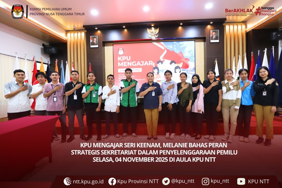 Kupang, ntt.kpu.go.id — Komisi Pemilihan Umum Provinsi Nusa Tenggara Timur kembali melanjutkan program KPU Mengajar dan telah memasuki seri keenam pada Selasa (4/11), bertempat di Aula KPU Provinsi NTT. Pada sesi kali ini, Plt. Sekretaris KPU Provinsi NTT, Melanie Sari Willa Hege, hadir sebagai narasumber dan memberikan pembekalan kepada peserta magang dari sejumlah perguruan tinggi di Kota Kupang. Berbeda dari seri sebelumnya yang berfokus pada aspek teknis pemilu, sesi ini secara khusus mengulas peran strategis kesekretariatan dalam mendukung penyelenggaraan pemilu. Dalam pemaparannya, Melanie mengajak peserta melihat lebih dekat bagaimana unit sekretariat bekerja mulai dari perencanaan program dan anggaran, pengelolaan data dan informasi, komunikasi publik, hingga penguatan sumber daya manusia. “Perencanaan bukan hanya soal administrasi. Ini soal memastikan setiap program terarah, terukur, dan membawa manfaat. Semua proses pemilu harus berdiri di atas perencanaan yang rapi dan bertanggung jawab,” ungkap Melanie yang juga merupakan Kabag Perencanaan, Data dan Informasi itu. Ia juga menyoroti pentingnya manajemen informasi dan data, termasuk peran media sosial sebagai ruang edukasi bagi pemilih. Menurutnya, literasi digital menjadi bagian penting dalam meningkatkan pemahaman publik terhadap demokrasi dan proses kepemiluan. “Di era digital, cara kita menyampaikan informasi menentukan bagaimana publik melihat KPU. Komunikasi publik itu bukan pelengkap, tapi bagian inti pelayanan kita,” tambahnya. Pada bagian akhir, Melanie menekankan bahwa keberhasilan pemilu tidak terlepas dari kualitas SDM di belakang layar. Ia mendorong peserta untuk melihat nilai-nilai integritas, kedisiplinan, dan kerja sama sebagai fondasi utama kerja penyelenggara pemilu. “Pemilu berjalan baik karena ada orang-orang yang mau bekerja dengan hati. Kekuatan kita ada pada komitmen dan profesionalisme,” ujarnya. Sesi berlangsung interaktif dan santai. Para peserta terlihat aktif memberikan pengalaman mereka selama beberapa bulan menjalani magang di KPU Provinsi NTT. Banyak dari mereka mengaku baru menyadari bahwa peran sekretariat begitu luas dan menjadi piajakan terlaksananya proses pemilu yang tertib dan transparan. Program KPU Mengajar seri keenam ini kembali menjadi ruang belajar yang mempertemukan generasi muda dengan pengalaman nyata dunia penyelenggaraan pemilu. KPU Provinsi NTT berharap melalui inisiatif ini semakin banyak anak muda terinspirasi dan siap mengambil peran dalam memperkuat kualitas demokrasi di daerah maupun nasional.