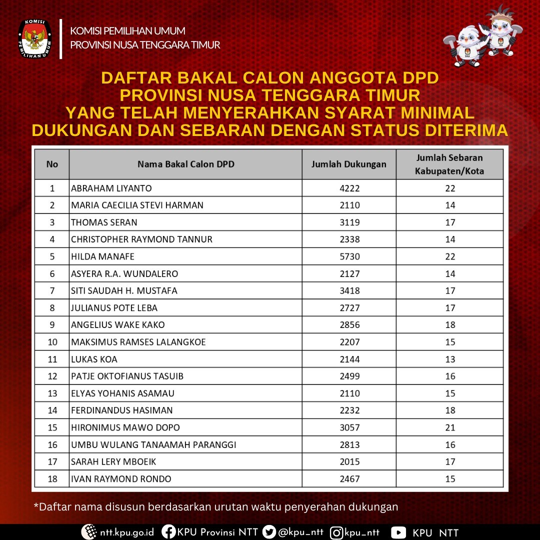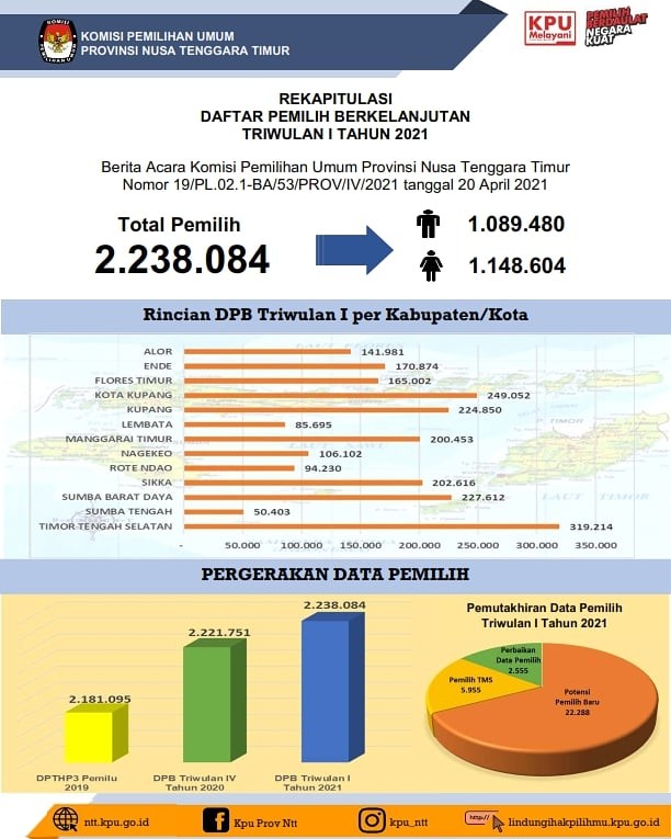 DPB Triwulan 1 Tahun 2021 Komisi Pemilihan Umum Provinsi Nusa Tenggara Timur (Selasa, 20/4/2021) menggelar Rapat Pleno Daftar Pemilih Berkelanjutan Tahun 2021 Periode Triwulan I. Dasar pelaksanaan kegiatan ini adalah ketentuan Surat Edaran Plt. Ketua Komisi Pemilihan Umum Republik Indonesia Nomor 132/PL.02.1-SD/01/KPU/II/2021 Tanggal 4 Februari 2021 perihal Pemutakhiran Data Pemilih Berkelanjutan Tahun 2021. Kegiatan dilaksanakan secara daring melalui sambungan zoom meeting dan dihadiri Polda NTT, Lantamal VII Kupang, Korem 161 Wirasakti Kupang, Kanwil Kementerian Agama Provinsi Nusa Tenggara Timur, Bawaslu Provinsi Nusa Tenggara Timur, Dinas Kependudukan dan Pencatatan Sipil Provinsi Nusa Tenggara Timur, Para Pimpinan Partai Politik Tingkat Provinsi Nusa Tenggara Timur. Dalam Rapat Koordinasi ini KPU Provinsi Nusa Tenggara Timur menetapkan hasil Rekapitulasi Daftar Pemilih Berkelanjutan dengan jumlah sebagai berikut 2.238.084 (Dua Juta Dua Ratus Tiga Puluh Delapan Ribu Delapan Puluh Empat) dengan rincian pemilih laki-laki berjumlah 1.089.480 (satu juta delapan puluh sembilan ribu empat ratus delapan puluh) pemilih dan pemilih perempuan berjumlah 1.148.604 (satu juta seratus empat puluh delapan ribu enam ratus empat tersebar di 13 (tiga belas) kabupaten/kota sesuai dengan rincian terlampir.