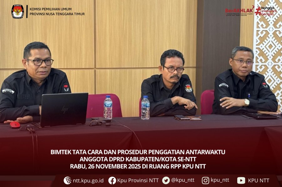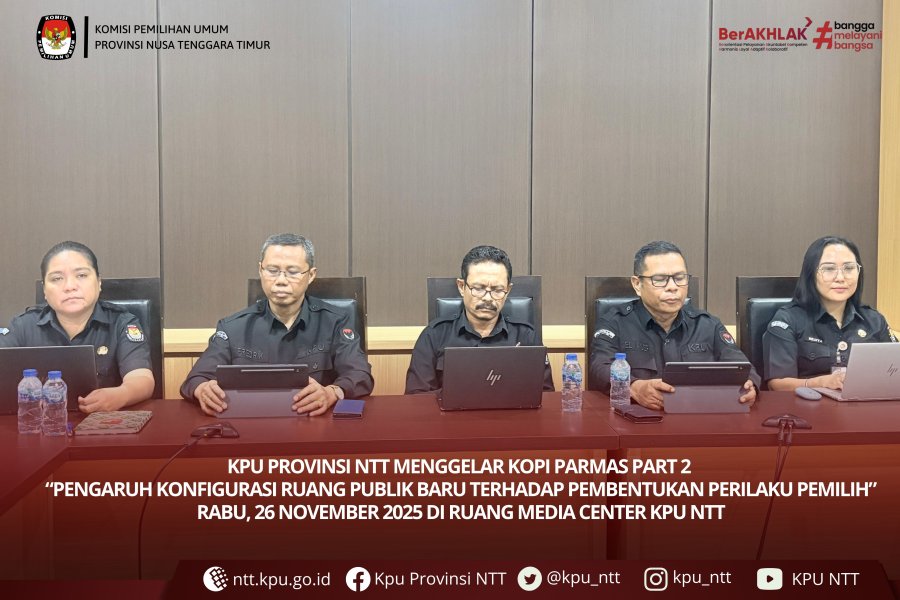 Kupang, ntt.kpu.go.id - KPU Provinsi Nusa Tenggara Timur menghelat diskusi Kopi Parmas Part 2, sebagai ruang berbagi gagasan dan penguatan kapasitas penyelenggara pemilu. Kegiatan yang berlangsung Rabu, 26 November 2025 itu mengusung tema “Pengaruh Konfigurasi Ruang Publik Baru terhadap Pembentukan Perilaku Pemilih.”. Diskusi panel tematik itu dipandu Moderator Elsa Diana Tambunan, menghadirkan dua narasumber, Yohanes B. D. Saleh Funan, Anggota KPU Kabupaten TTU, dan Fredy Umbu Bewa Guty, Ketua KPU Kabupaten Sumba Tengah.