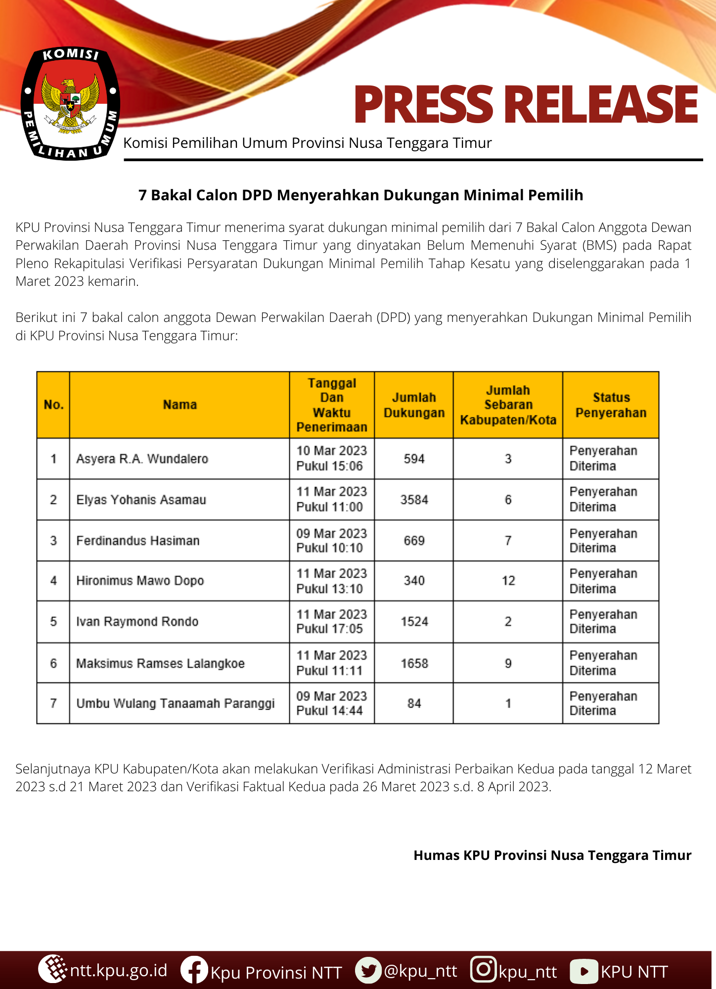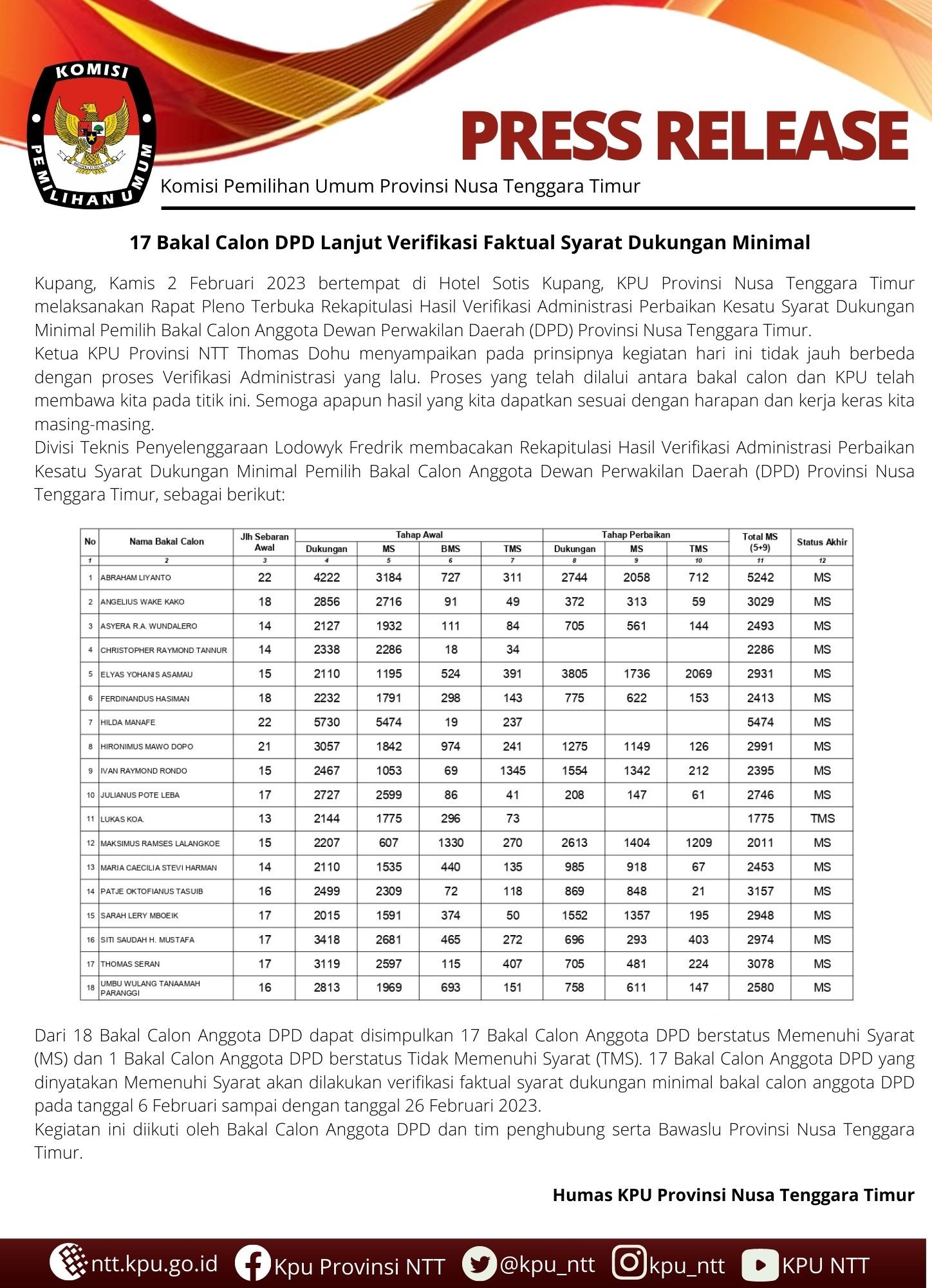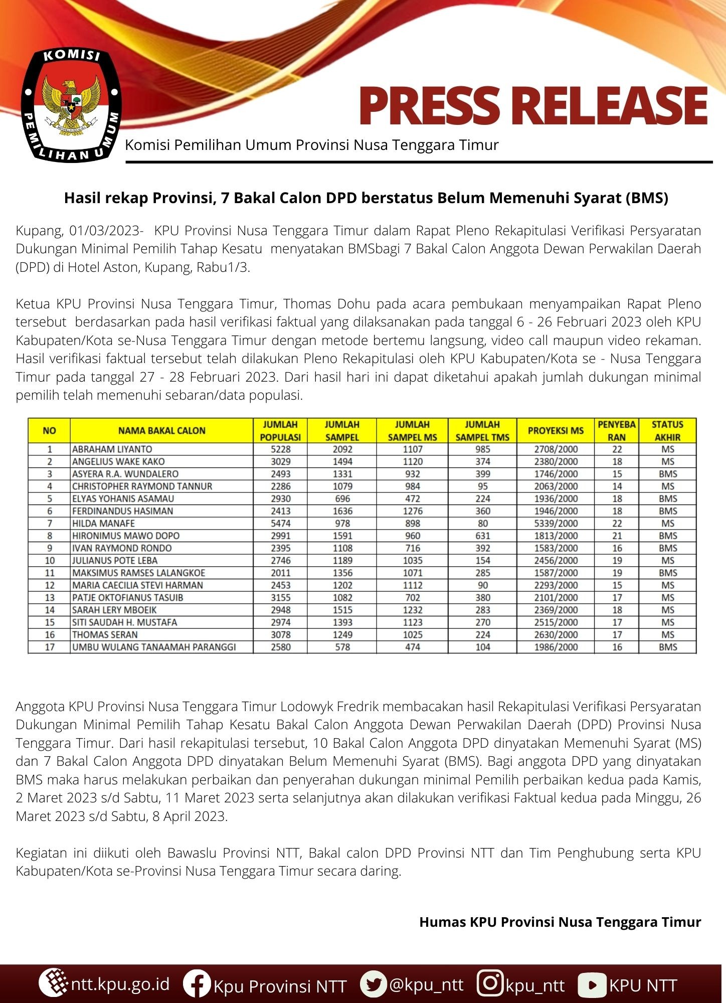 Hasil rekap Provinsi, 7 Bakal Calon DPD Belum Memenuhi Syarat Rabu, 01 Maret 2023 20:00 106 Berikut ini Press Release Verifikasi Anggota DPD Baca Selengkapnya