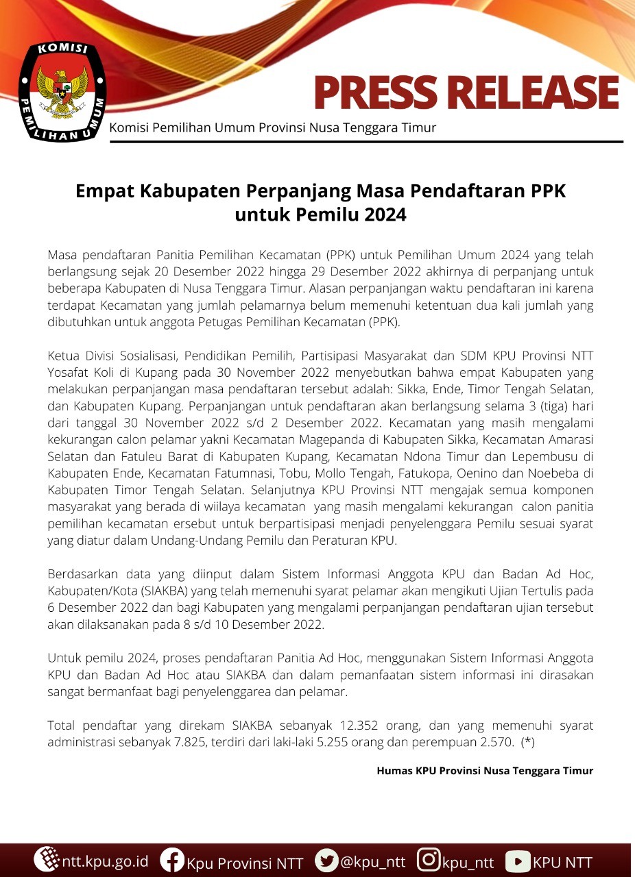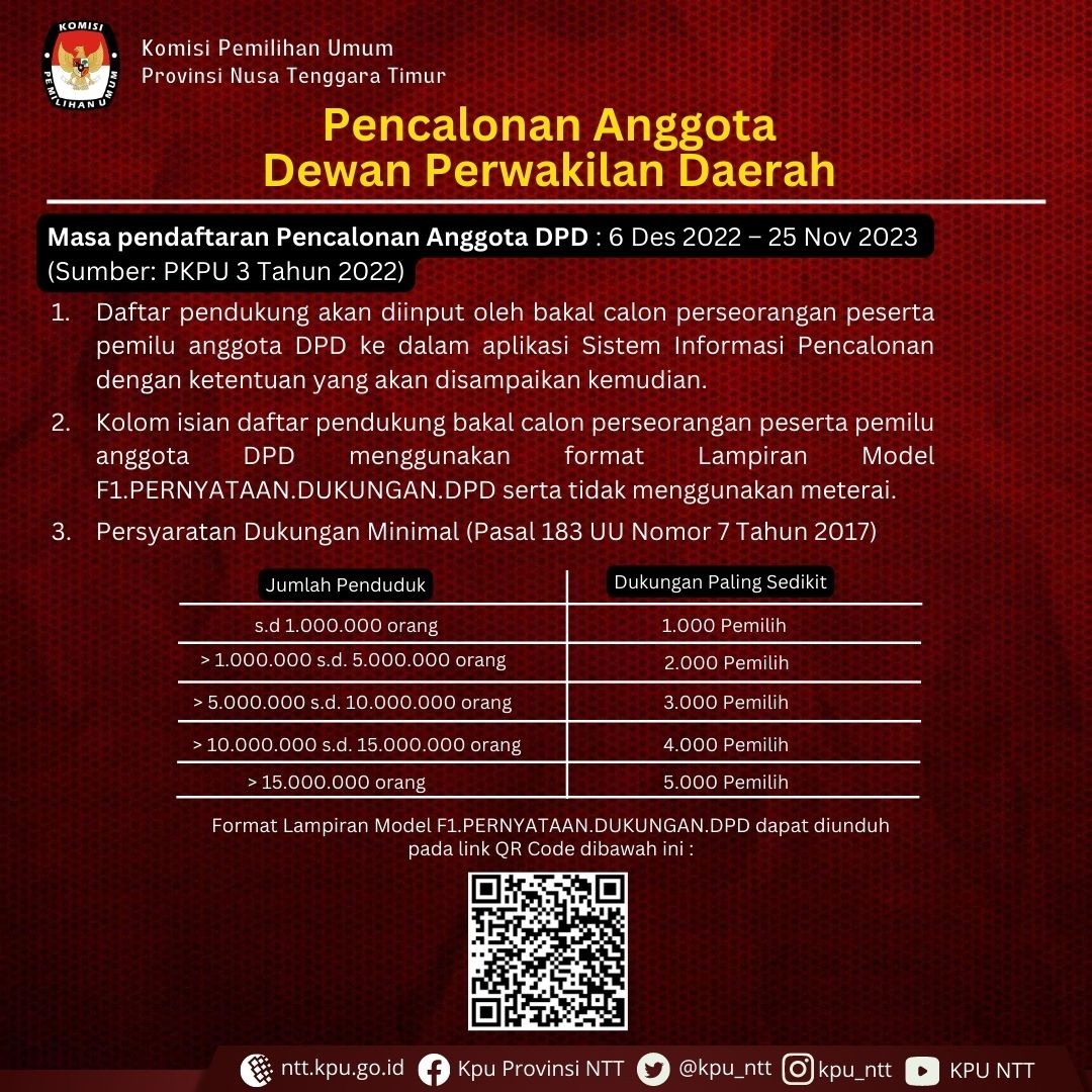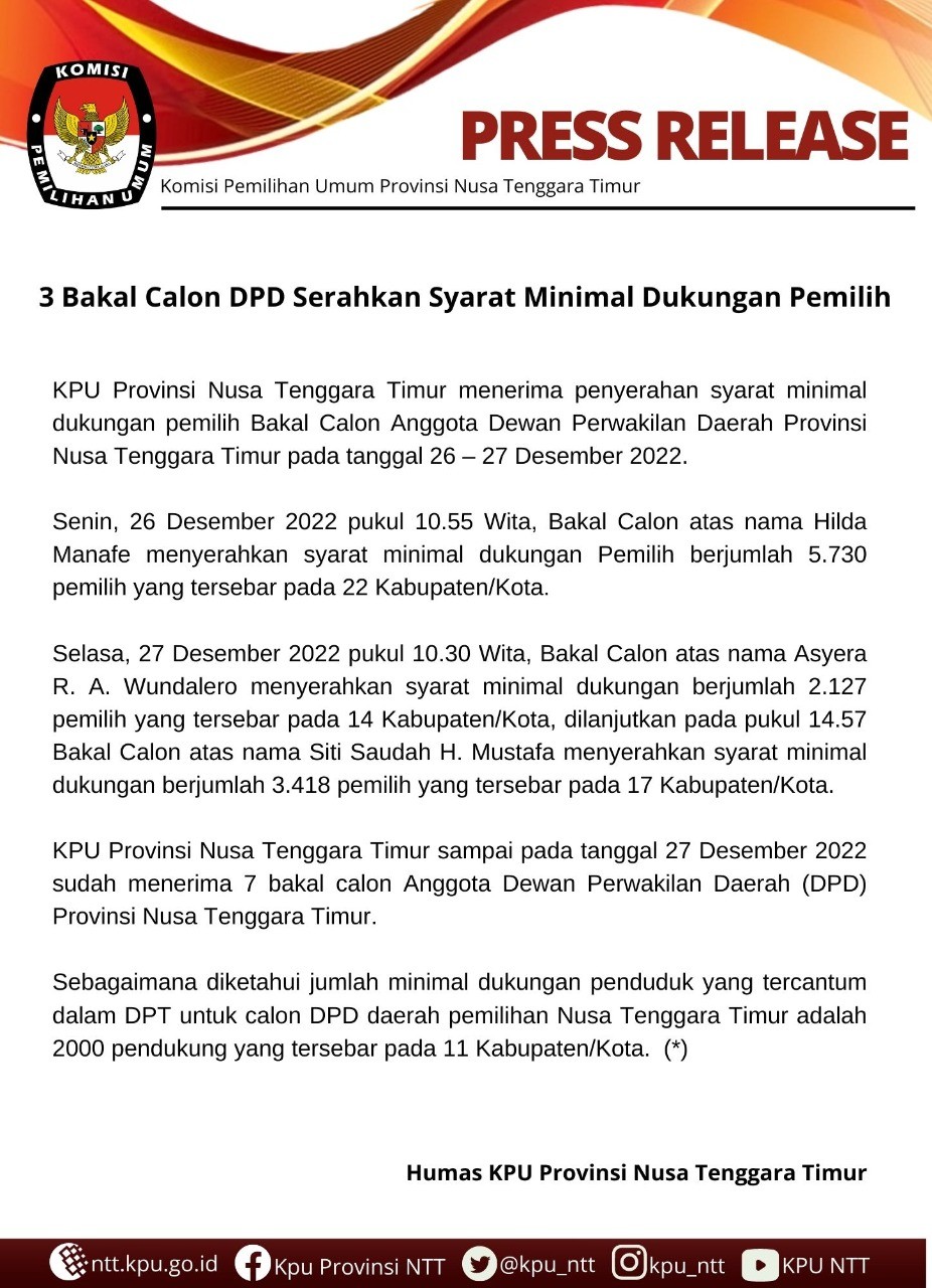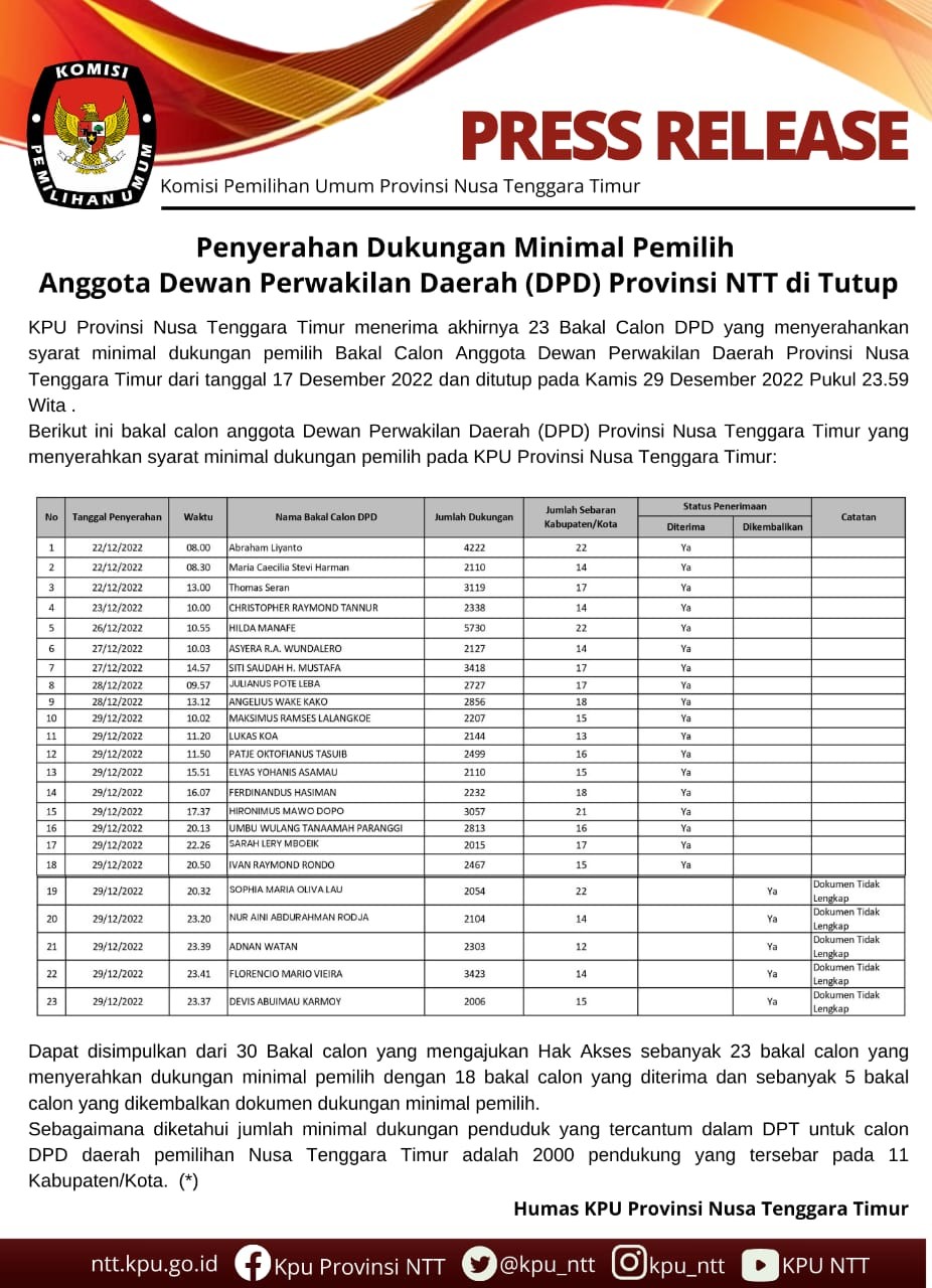 PENYERAHAN DUKUNGAN MINIMAL PEMILIH ANGGOTA DPD DITUTUP Jumat, 30 Desember 2022 07:00 28 Download Baca Selengkapnya