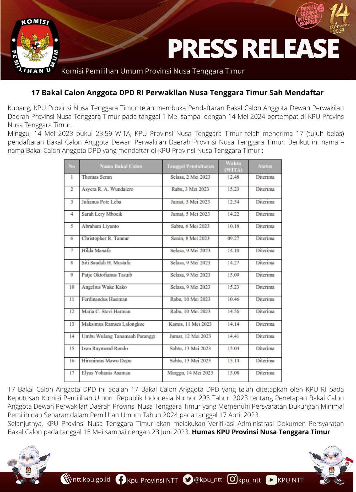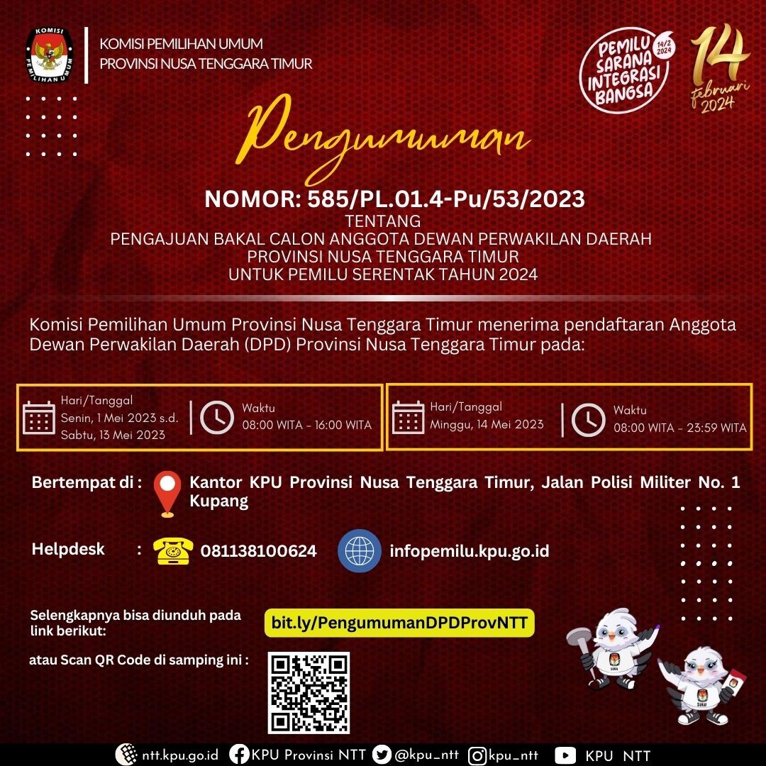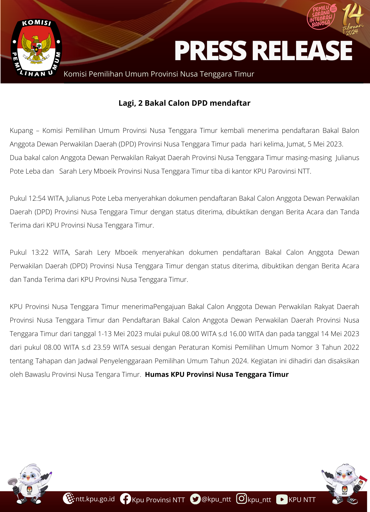 PENGUMUMAN PENGAJUAN BAKAL CALON ANGGOTA DEWAN PERWAKILAN DAERAH PROVINSI NUSA TENGGARA TIMUR UNTUK PEMILU SERENTAK TAHUN 2024 Senin, 24 April 2023 07:00 148 Komisi Pemilihan Umum Provinsi Nusa Tenggara Timur menerima pendaftaran Anggota Dewan Perwakilan Daerah (DPD) Provinsi Nusa Tenggara Timur Info selanjutnya silahkan klik disini PengumumanDPD Baca Selengkapnya