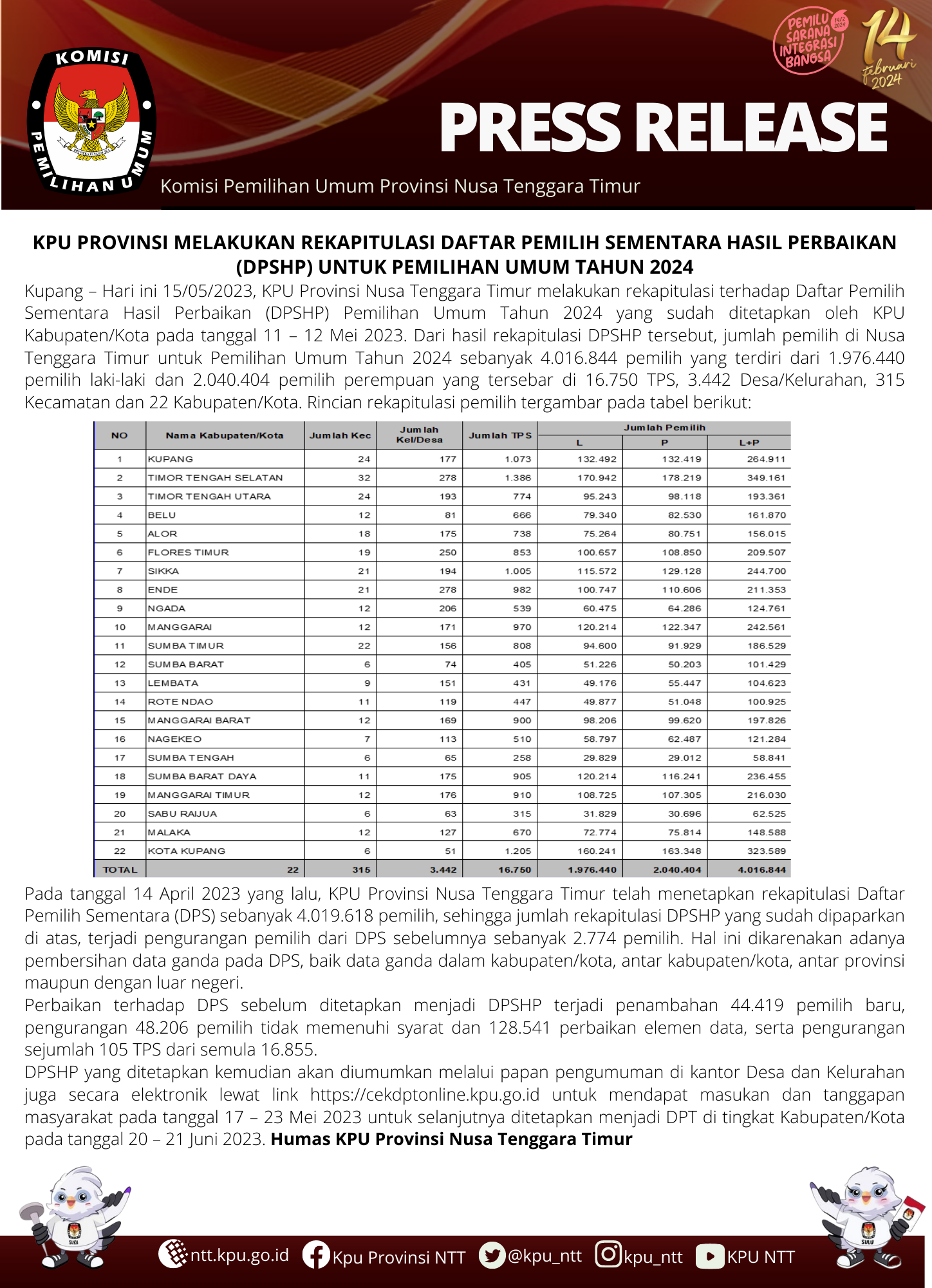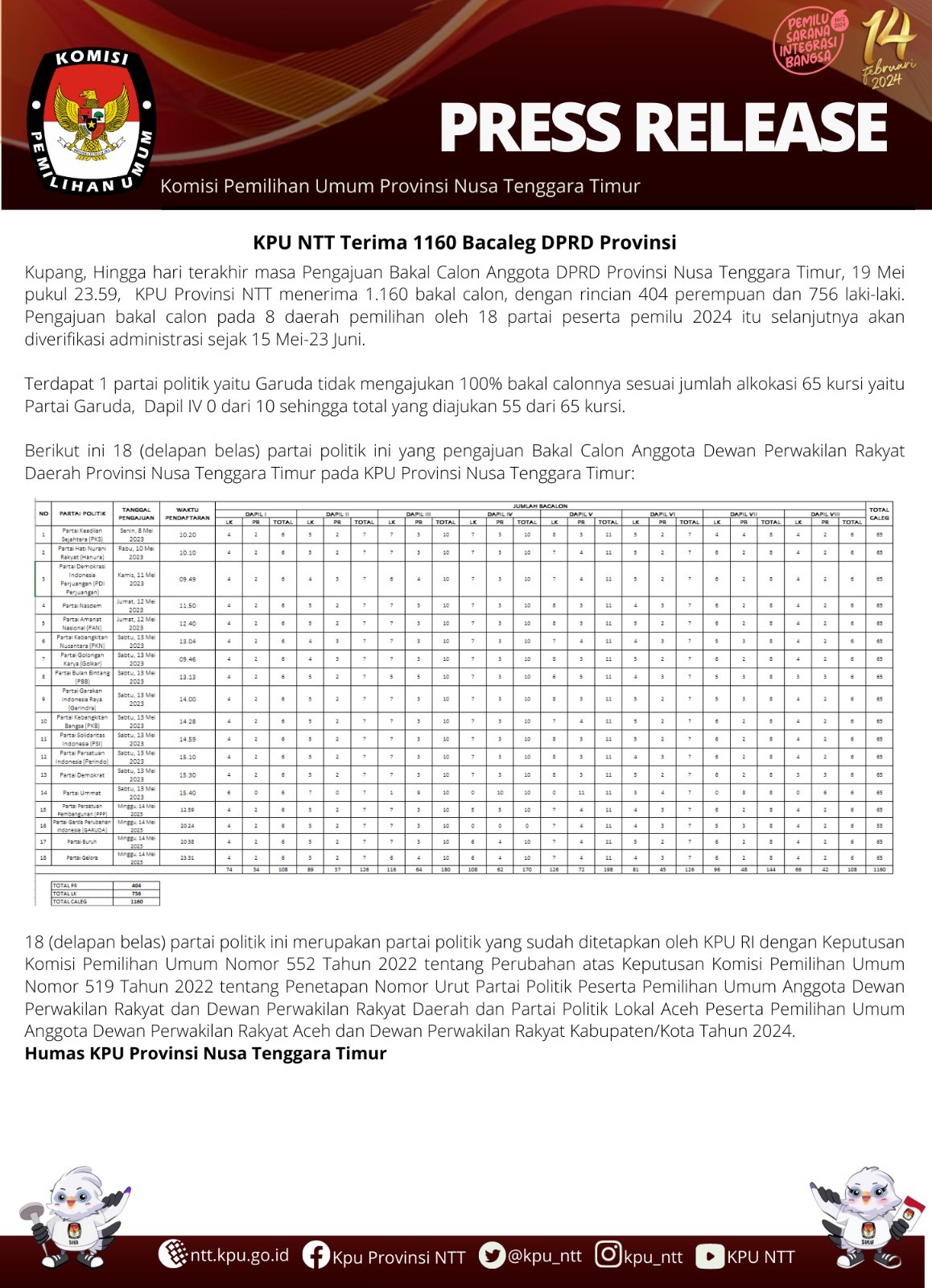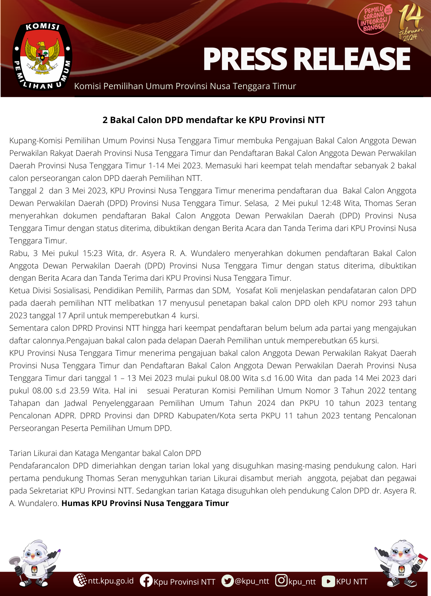 PENGUMUMAN PENGAJUAN BAKAL CALON ANGGOTA DEWAN PERWAKILAN DAERAH PROVINSI NUSA TENGGARA TIMUR UNTUK PEMILU SERENTAK TAHUN 2024 Senin, 24 April 2023 07:00 148 Komisi Pemilihan Umum Provinsi Nusa Tenggara Timur menerima pendaftaran Anggota Dewan Perwakilan Daerah (DPD) Provinsi Nusa Tenggara Timur Info selanjutnya silahkan klik disini PengumumanDPD Baca Selengkapnya